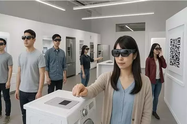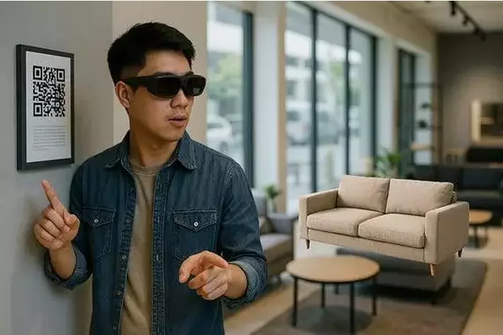 ショールーム内にQRコードを設置し、ARグラスを装着したまま店内のあらゆる場所で製品シミュレーションを行うこともできます。