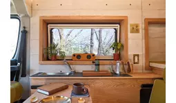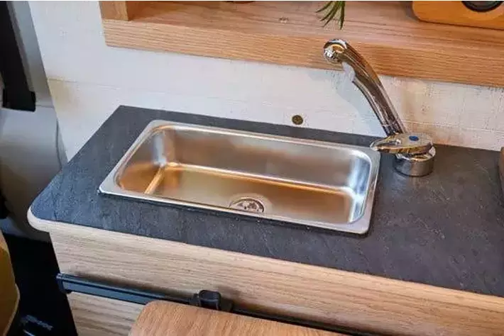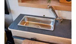 ちょっとした洗い物や手洗い等に活躍するステンレス製のミニシンク(給排水タンク各12L)を搭載。車高の高いフィアットデュカトがベースなので、キッチンカウンターの前に立って作業することも可能です。(室内高1,850mm)