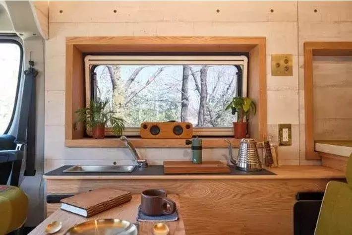 天井や床、壁の内装仕上げは、ワインの樽に使用されるほど水にも強い無垢材で知られる「オーク材」を使用。かつ、サーフィン、釣り、スノーボードなど様々な趣味・アクティビティでも気兼ねなく使用できるよう、バンドソー加工というヴィンテージ加工を促し、その上から床・壁それぞれのイメージに合う塗装を促したこだわりの設計。 オーク材の原木をスライスした材料からそれぞれのパーツに使用しており、原木ごとの独自の木目や節の美しさが際立ち、一台一台が個性的で唯一無二の仕上がりとなります。