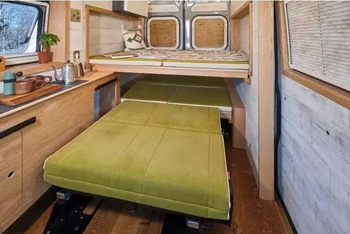 リヤ常設ベッドのサイズは、L1,305mm×W1,820mm。車両に対して横向きで大人2名就寝が可能な広いベッドスペースです。