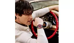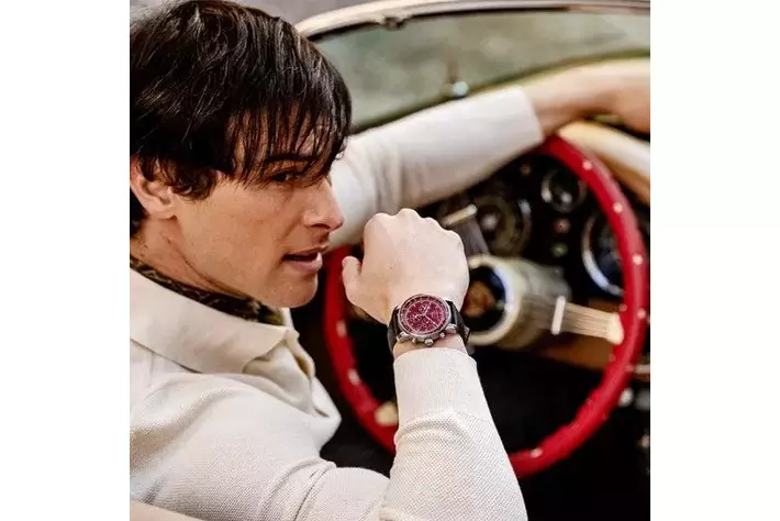 ダイヤルにはレッド文字盤を採用。車のボディを想起させ、スポーティな印象にまとめ上げています。