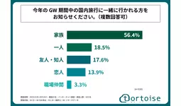 また、「今年のGW期間中の国内旅行に一緒に行かれる方」を尋ねる設問の回答では、1位が「家族」で56.4%、2位が「一人」で18.5%、3位が「友人・知人」で17.6%となりました。この結果から「家族」での旅行を計画されている人が最も多いものの、「一人旅」を予定している人も2割弱いる、ということがわかりました。