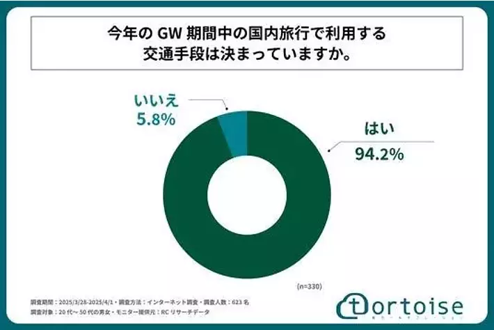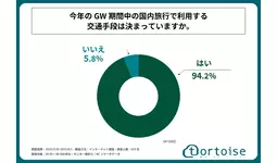 続いて、「今年のGW期間中の国内旅行で利用する交通手段は決まっているか」を尋ねる設問の回答では、「はい」が94.2%、「いいえ」が5.8%という結果になりました。この結果から、約95%の人は今年のGW期間中の国内旅行で利用する交通手段も既に決めていることが判明しました。