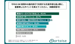 調査の最後、「今年のGW期間中の国内旅行で利用する交通手段は決まっている」と回答された方に「今年のGW期間中の国内旅行で利用する交通手段を選ぶ際に、重要視したポイント」を問う設問への回答では、1位が「費用がリーズナブルであること」で43.4%、2位が「目的地まで早くつくこと」で35.7%、3位が「家族や友人と一緒の空間で過ごせること」で34.1%となりました。また、4位以降も回答率30%前後の回答が複数続く形となり、この結果から、国内旅行で利用する交通手段を選ぶ際に、重要視するポイントは様々あることがわかりました。