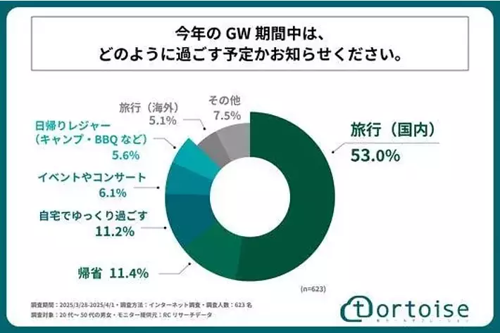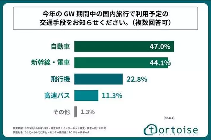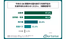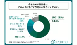 株式会社トータス(本社:神奈川県大和市、代表取締役:村野 公紀)が運営する「tortoise」は、20代~50代の男女を対象に「GW期間中の国内旅行と交通手段に関する調査」を実施しました。この調査結果から、20代~50代の男女の今年のGWの国内旅行の予定や、旅行で使用する予定の予算や交通手段などが明らかになりました。