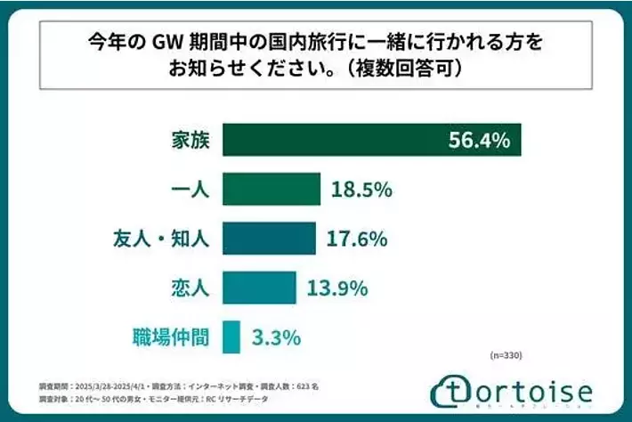 今年のGW期間中の国内旅行に一緒に行く人のトップ3は、1位「家族」、2位「一人」、3位「友人・知人」