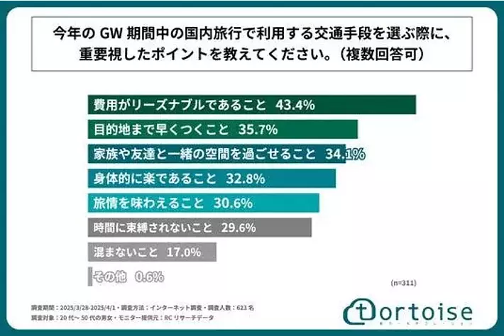 今年のGW期間中の国内旅行で利用する交通手段を選ぶ際に、重要視したポイントのトップ3は、1位「費用がリーズナブルであること」、2位「目的地まで早くつくこと」、3位「家族や友人と一緒の空間を過ごせること」