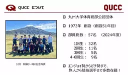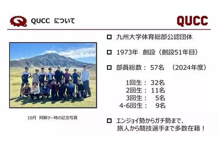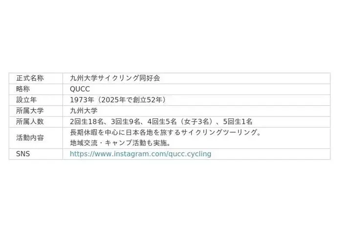 1973年に設立された九州大学サイクリング同好会(QUCC)は、全国を旅するサイクリング活動を通じて自然と地域に触れながら、自立心と社会性を育む歴史ある学生団体です。