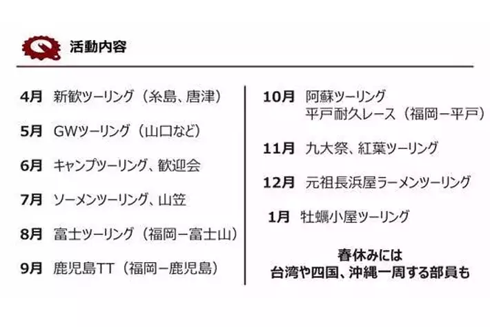 QUCCは現在、2回生16名・3回生9名・4回生3名・5回生1名・6回生2名(うち女子7名)全体:36名が在籍しており、全国をめぐる長期ツーリングなどを中心に活動を展開しています。
