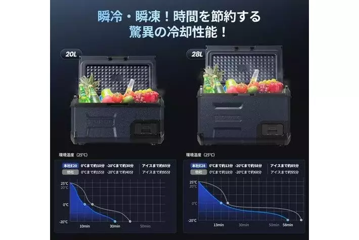 高性能コンプレッサーによって、素早い冷却を実現します。冷却範囲は-20℃~10℃で、E20は約10分で0℃に到達、約30分で-20℃まで冷却可能です。E28については、約13分で0℃、約58分で-20℃に達します。