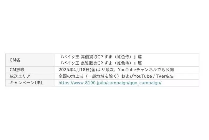 「まだ世界にない、感動をつくる。」をコーポレートミッションに掲げ、ビジョンである「バイクライフの生涯パートナー」の実現に向けて、事業を展開する株式会社バイク王&カンパニー(代表取締役CEO:澤 篤史、本社:東京都世田谷区、証券コード:3377、以下「当社」)は、2025年4月18日(金)より当社公式アンバサダーとして就任した、総フォロワー数340万人(YouTubeとSNS合計)超えの大人気SNSクリエイターのずま(虹色侍)さん(以下、ずまさん)による新TVCM『バイク王 高価買取CP ずま(虹色侍)』篇、『バイク王 良質販売CP ずま(虹色侍)』篇を公開いたします。