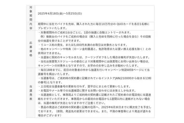 期間中、当社でバイクを売却・購入された方を対象に、抽選で毎日1名様に10万円分のQUOカードをプレゼントいたします。売却・購入にかかわらず取引額が5,000円以上の方であればどなたでも当キャンペーンの対象となります。「バイクの購入を考えている」、「乗り換えをしようか迷っている」、「最近乗っていないバイクがある」など、バイクの売却・購入をご検討の方はこの機会をぜひお見逃しなく!