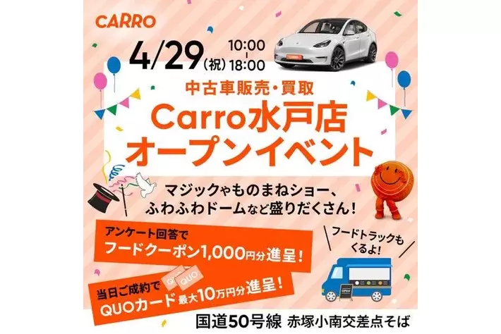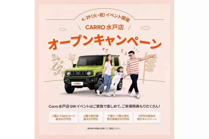 "新品のような状態”の中古車を目指す、あんしんと信頼の中古車マーケットプレイス「Carro(カーロ) 」が、水戸にオープン!2025年4月29日(火・祝)にご家族で楽しめる記念イベント開催