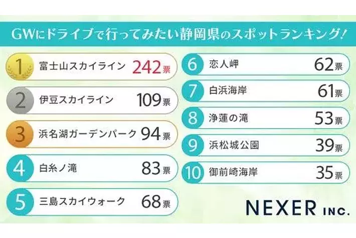 GWにドライブで行ってみたい静岡県のスポットランキング、圧倒的票数で第1位に輝いたのは「富士山スカイライン」でした。富士山の絶景が楽しめる爽快ルートとして圧倒的な支持を獲得。