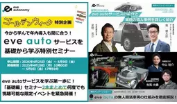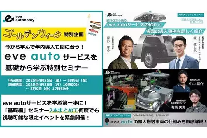 株式会社eve autonomy(イヴ・オートノミー、静岡県磐田市、代表取締役CEO:星野 亮介、以下「eve autonomy」)は、ゴールデンウィーク期間となる2025年4月28日(月)~5月9日(金)まで、当社の自動搬送サービス「eve auto」の基本を学べるセミナー第一回・第二回をまとめた特別視聴企画「今から学んで年内導入も間に合う!eve autoサービスを基礎から学ぶ特別セミナー」を開催いたします。本企画では、期間中いつでも、何度でも動画をご視聴いただくことが可能です。