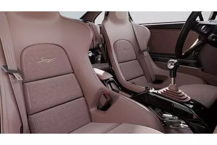 Singerのレストアおよびモディフィケーションサービスでは、特注のペイント、レザー、素材の仕上げなど、オーナーの好みに合わせてインテリアをパーソナライズできます。軽量スポーツシートまたはトラックシートをリクエストでき、高めのシフトレバー機構と相まって、最適なドライビングポジションを実現します。