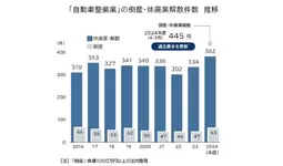 2024年度の自動車整備事業者の休廃業・解散件数は382件で、過去最多を更新し、倒産を含めると計445件が市場から消滅した。人件費やパーツ仕入価格の高騰、少子高齢化によるユーザー減少、整備士不足に加え、保険修理の単価低迷といった悪条件も重なった。大手自動車メーカーで整備士の育成や、損保会社との連携など業界の改善に向けた取り組みが進むが、整備ニーズの変化に対応できない事業者の淘汰は続く可能性がある。