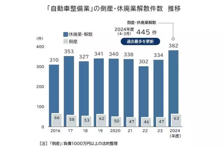 自動車整備を担う事業者の市場撤退が加速している。2024年度(2024年4月~2025年3月)に発生した「自動車整備」事業者の休廃業・解散(廃業)は382件となり、過去最多を更新した。前年度(334件)から約15%増加したほか、倒産(負債1000万円以上、法的整理)に至った63件を含めると、過去最多となる445件が自動車整備の現場から消滅した。
