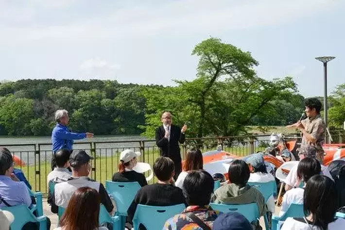 ゴールデンウィーク後半、多数の来場者で賑わうメッツァビレッジ。ヤノベが「世界最速の彫刻」と銘打つ高性能電気自動車《SHIP’S CAT(Speeder)》(シップス・キャット スピーダー)をバックに、トークイベントがスタート。