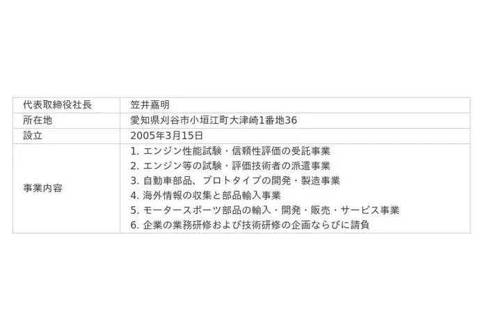 「人と技術」を中核に、自動車開発のスペシャリストとして技術と経験を追求し、お客様や地域社会から支持される会社を目指し日々挑戦を続けています。弊社の事業は、エンジン試験受託/試作車両開発/部品試作・治具製作/試験装置開発/海外情報・部品調達/技術者派遣事業などで自動車技術開発支援をしております。
