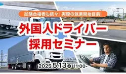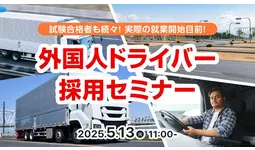 タイトル:試験合格者も続々!実際の就業開始目前!「外国人ドライバー採用セミナー」開催日時:2025年5月13日(火) 11:00 ~ 12:00 ※10分前から入室可能