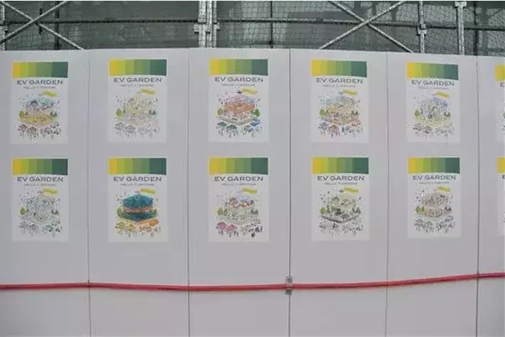 株式会社EV GARDENは、福島日産のグループ会社です。現在、2025年秋のオープンを目指し福島市北町に建設中の、地域に新しいくつろぎとにぎわいを創出する施設「EV GARDEN」。その工事現場の仮囲いに、同市の保育園に通う子どもたちが思い思いに色を散りばめた塗り絵を掲出しています。