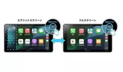 ・ 「Apple CarPlay」使用時に、本機や対応アプリを操作するショートカットキーを画面に表示する「スプリットスクリーン」を採用※2。切換えボタンをタップするだけで簡単にスクリーンモードを変更できるので、画面を遷移することなく、目的の操作をスムーズに行えます。