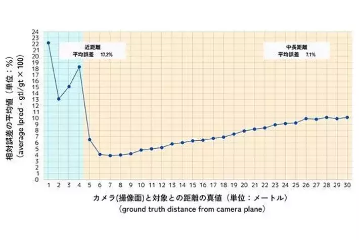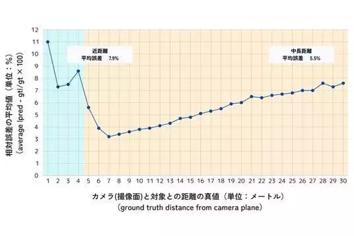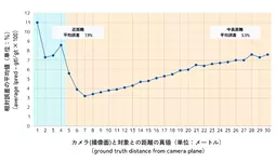 近距離(1-4m)と中長距離(5-30m)、それぞれの距離に対応するデータセットを用いて評価を行いました。以下のグラフは、カメラ撮像面と対象との距離について、真値に対する距離推定の相対誤差の平均値を示しています。たとえば、対象までの距離が10mの場合、高精度モデルでは距離推定の相対誤差は3.8%で、これは平均して38cmほどのズレが生じることを意味します。中長距離全体(5-30m)では、相対誤差の平均は5.5%です。