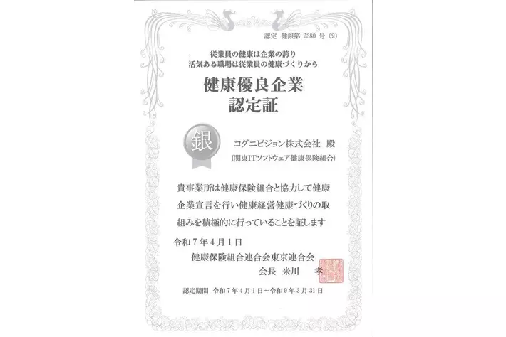コグニビジョン株式会社(本社:新宿区西新宿 代表取締役社長:島田浩二)は、令和7年4月1日付で健康優良企業「銀の認定」に更新認定されましたので、お知らせします。