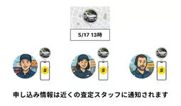 ユーザーは車両情報に加え、希望する査定日時・場所を設定するだけ。設定情報はストリマに登録している近隣査定スタッフへ通知され、査定を希望する店舗は指定場所へ直接向かいます。