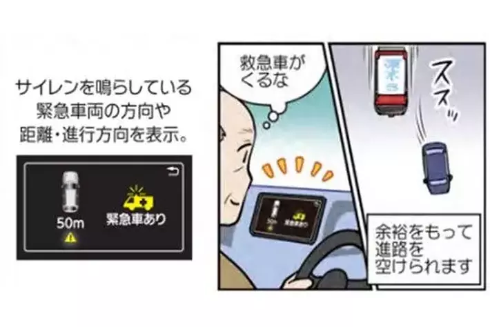 【救急車の接近】をお知らせ!サイレンを鳴らしている救急車が近づいてくると、おおよその方向と距離を画面と音でドライバーにお知らせしてくれる機能です。周りの騒音でサイレンが聞こえにくいなどの状況でも、事前に救急車の接近を知り、余裕をもって道路を空けることができます。