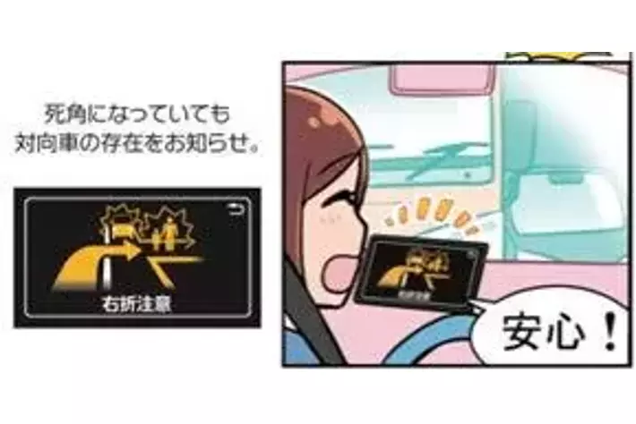 右折時に死角になっていて見にくい対向車や人の存在をドライバーにお知らせ。衝突事故防止に役立ちます。