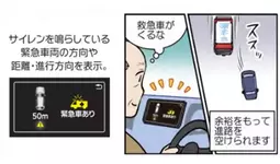 【救急車の接近】をお知らせ!サイレンを鳴らしている救急車が近づいてくると、おおよその方向と距離を画面と音でドライバーにお知らせしてくれる機能です。周りの騒音でサイレンが聞こえにくいなどの状況でも、事前に救急車の接近を知り、余裕をもって道路を空けることができます。