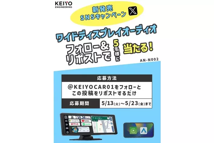株式会社慶洋エンジニアリング(所在地:東京都港区新橋公式Xにて2025年5月13日(火)より「ワイドディスプレイオーディオAN-N002」プレゼントキャンペーンを実施中です。