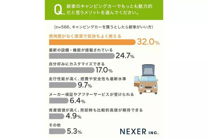 続いては、「新車を購入したい」と答えた方に、新車のキャンピングカーでもっとも魅力的だと思うメリットを選んでもらいました。