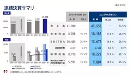 当第3四半期連結累計期間の売上高は47,558百万円(前年同期比13.5%増)となりました。利益面におきましては、営業利益は10,152百万円(同26.0%増)、経常利益は10,227百万円(同25.1%増)、親会社株主に帰属する四半期純利益は7,004百万円(同25.3%増)となりました。