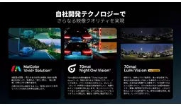 さらに、70mai独自の映像最適化技術「70mai MaiColor Vivid+ Solution」により、照明環境に応じた自動調整が可能。夜間映像も「70mai Night Owl Vision」によるノイズ軽減や、「70mai Lumi Vision」の暗所強化機能によって、深夜の走行中や駐車中でも安心の高画質を実現しました。