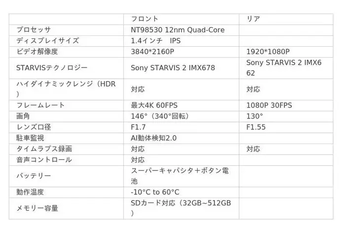 「Dash Cam 4K Omni」は、フロントにSONY STARVIS 2 IMX678、リアにSONY STARVIS 2 IMX662を搭載し、前後HDR撮影にも対応。明暗差の激しい環境でも、ナンバープレートや周囲の状況をくっきりと記録します。
