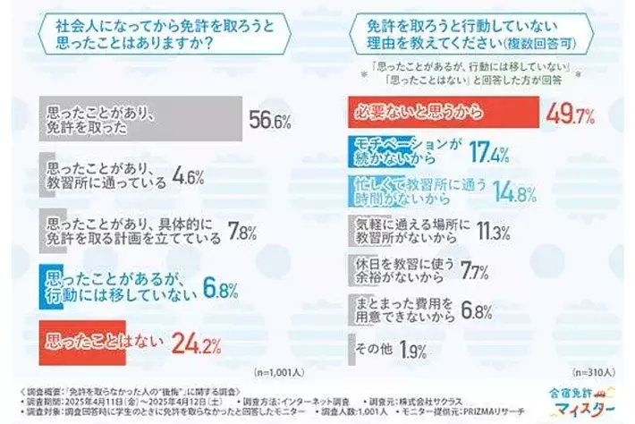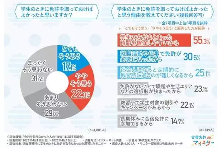 そこで今回、合宿免許比較サイト「合宿免許マイスター」(https://menkyo-meister.com/)を運営する株式会社サクラスは、学生のときに免許を取らなかった方を対象に、「免許を取らなかった人の“後悔”」に関する調査を実施しました。
