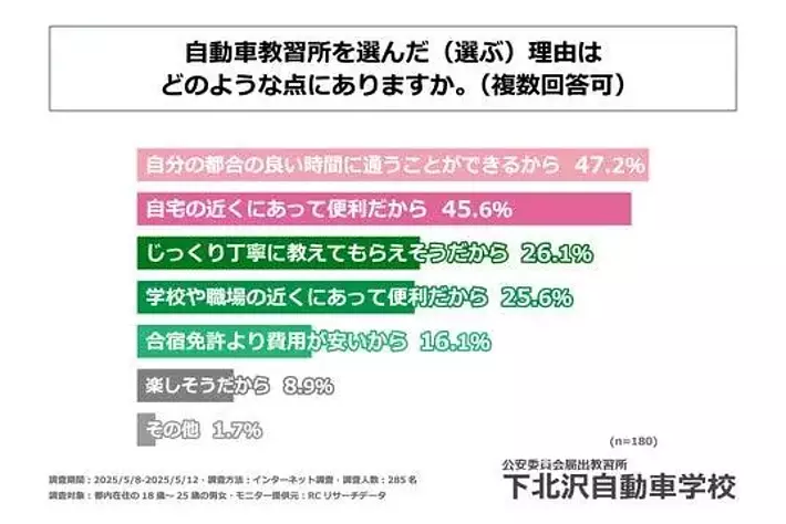 また、運転免許を自動車教習所で取得した、または今後取得したいと回答された方に「自動車教習所を選んだ(選ぶ)理由はどのような点にあるか」を尋ねる設問への回答では、1位が「自分の都合の良い時間に通うことができるから」で47.2%、2位が「自宅の近くにあって便利だから」で45.6%、3位が「じっくり丁寧に教えてもらえそうだから」で26.1%という結果になりました。ここでは利便性の良さに関する回答が上位に並ぶ形となりました。