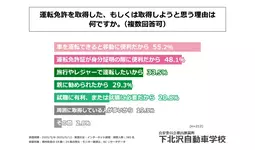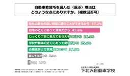 また、運転免許を自動車教習所で取得した、または今後取得したいと回答された方に「自動車教習所を選んだ(選ぶ)理由はどのような点にあるか」を尋ねる設問への回答では、1位が「自分の都合の良い時間に通うことができるから」で47.2%、2位が「自宅の近くにあって便利だから」で45.6%、3位が「じっくり丁寧に教えてもらえそうだから」で26.1%という結果になりました。ここでは利便性の良さに関する回答が上位に並ぶ形となりました。