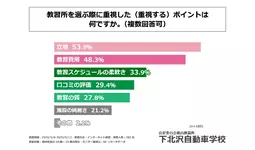 次に、運転免許を自動車教習所で取得した、または今後取得したいと回答された方に「教習所を選ぶ際に重視した(重視する)ポイントは何か」を尋ねる設問への回答では、1位が「立地」で53.9%、2位が「教習費用」で48.3%、3位が「教習スケジュールの柔軟さ」で33.9%という結果になりました。また、4位以降も回答率20%を超える回答が複数並ぶ形となり、この結果から教習所を選ぶ際に重視するポイントは多岐に渡ることがわかりました。