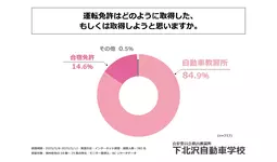 続いて、普通自動車免許を取得しているか、今後取得する意向があると回答された方に、「運転免許はどのように取得した、もしくは取得しようと思うか」を尋ねる設問への回答では、「自動車教習所」が84.9%、「合宿免許」が14.6%という結果になりました。この結果から、大半の人が「自動車教習所」で運転免許を取得したか、今後運転免許を取得しようと考えていることが判明しました。