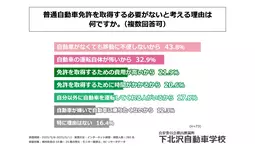 調査の最後、普通自動車免許を持っておらず、今後取得する予定もないと回答された方に「普通自動車免許を取得する必要がないと考える理由」を尋ねる設問の回答で多かったのは、1位が「自動車がなくても移動に不便しないから」で43.8%、2位が「自動車の運転自体が怖いから」で32.9%、3位が「免許を取得するための費用が高いから」で21.9%という結果になりました。この結果から「自動車がなくても移動に不便しないこと」が普通自動車免許を取得しない最大の理由であることが明らかになりました。