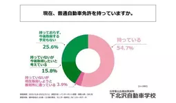まず、「現在、普通自動車免許を持っているか」を尋ねる設問への回答では、1位が「持っている」で54.7%、2位が「持っておらず、今後取得する予定もない」で25.6%、3位が「持っていないが今後取得したいと考えている」で15.8%という結果になりました。また、「持っていないが現在取得しようと教習所に通っている」という回答をした人も3.9%おり、この結果から都内在住の18歳~25歳の男女の約75%が普通自動車免許を取得しているか、今後取得する意向があることが明らかになりました。