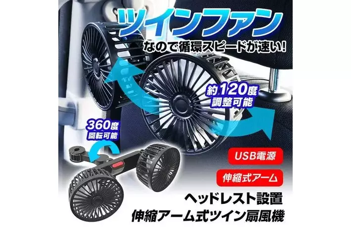 ヘッドレストに簡単に取付けられ、後部座席を涼しくしてくれる小型ツインファンです。