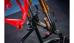 サスペンションはShowa製o43mmBFFフロントフォークと、BFRC liteリヤショックを備え、リヤショックは垂直に配置することで、理想的な路面追従性を実現。上部のエキセントリックシャフトにより15mm上下に調整が可能となっています。