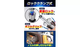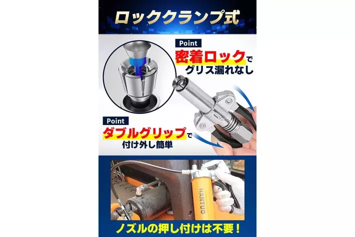 登録済み意匠により密着ロックでグリス漏れを防止。6爪ダブルグリップがニップルを確実にキャッチし、ノズルを押し付ける必要なし。漏れ・外れ・グリス飛散を大幅軽減。初心者でも安心。