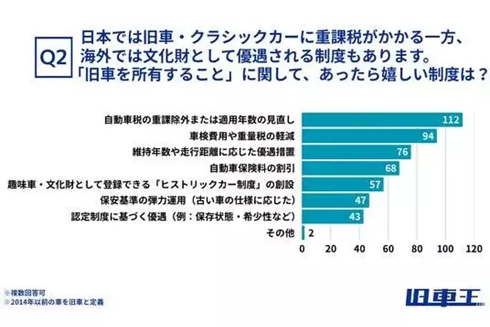 ・調査内容:Q1.自動車税(種別割)の納税額に不満はありますか? Q2.日本では旧車・クラシックカーに重課税がかかる一方、海外では文化財として優遇される制度もあります。「旧車を所有すること」に関して、あったら嬉しい制度は?(複数選択可) Q3.毎年支払う旧車の自動車税はいくらですか?