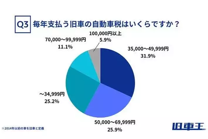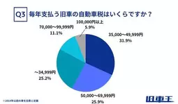 旧車オーナーの約6割が年間35,000円以上の自動車税を支払っており、特に「35,000~49,999円」が最も多く(31.9%)、次いで「50,000~69,999円」(25.9%)、「~34,999円」(25.2%)と続きました。さらに、「100,000円以上」と回答した方も5.9%存在し、旧車の維持にかかる税負担の大きさが浮き彫りとなりました。